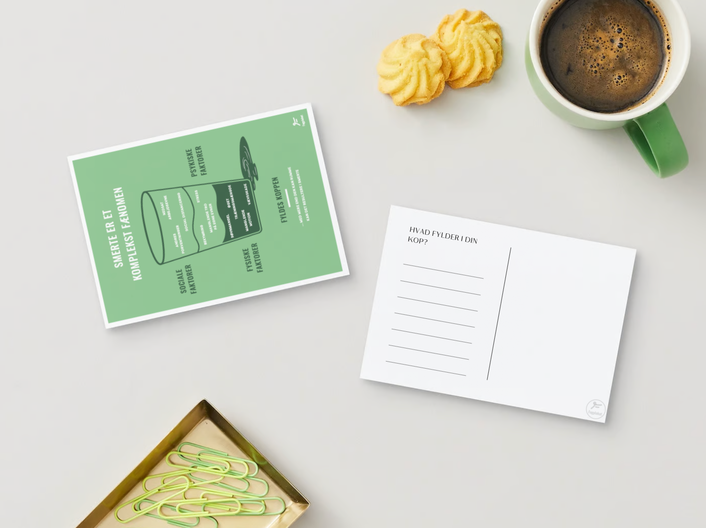 Vores handouts udgør specialdesignede forklaringsmodeller, som sundhedsprofessionelle kan udlevere til deres klienter med forskellige formål, såsom reflektionsopgaver, værktøjer til håndtering eller påmindelser med essentielle budskaber. Disse handouts præsenteres i et fysisk kortformat svarende til et postkort (A6), hvor forsiden indeholder en af vores populære fagplakater, mens bagsiden rummer et reflektionsspørgsmål skræddersyet til det pågældende kort. Der er også tilstrækkelig plads til at nedfælde egne noter eller illustrere øvelser.